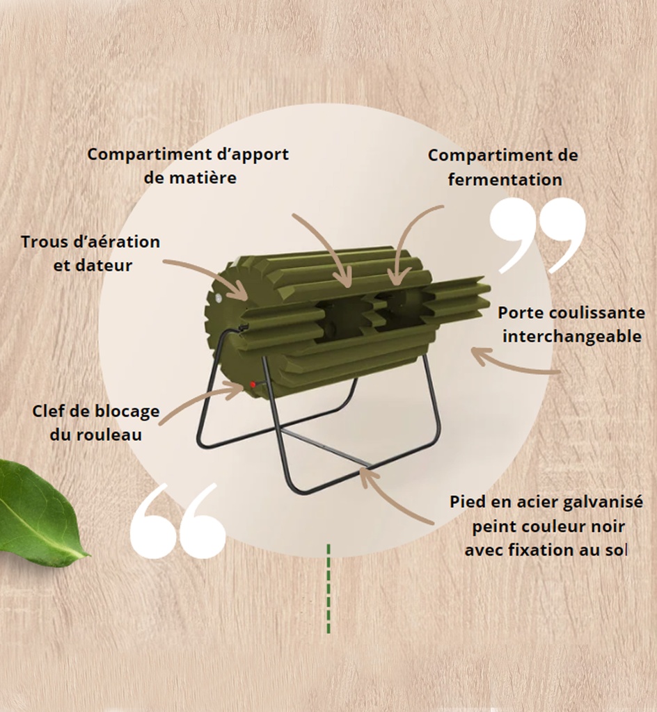 Son usage ultra simple permet de l’utiliser partout, en extérieur comme en intérieur, à l’ombre. La collecte du compost se fait par basculement du rouleau et ouverture de la trappe. En période hivernale, un apport de vers favorisera la dégradation.